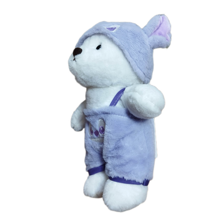 این خرس ایستاده با لباس و کلاه فانتزی مدل استیچ، ساختهشده از پارچه پولیشی نرم و ضد حساسیت است. طراحی کارتونی و رنگبندی سفید–بنفش آن، انتخابی عالی برای هدیه، دکور اتاق کودک یا همراه بازی روزمره است.